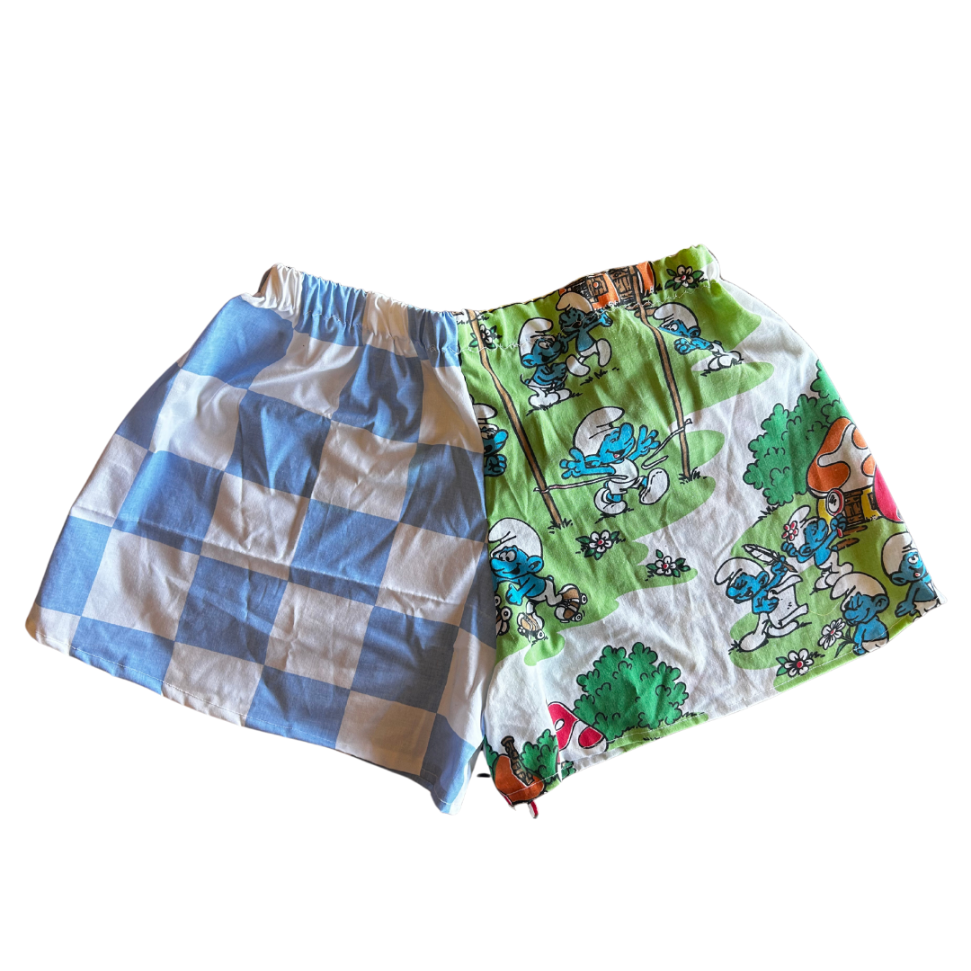 This funky two-piece set brings vintage cartoons and countryside charm together in one playful outfit. The top is handmade from Smurfs bedsheets featuring mushroom cottages, forest fun, and all the blue cuteness you can handle. The shorts are color-blocked with a pastel blue gingham pillowcase on one side and Smurf graphics on the other for an asymmetrical twist that screams quirky cool.