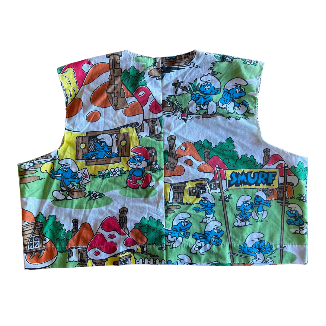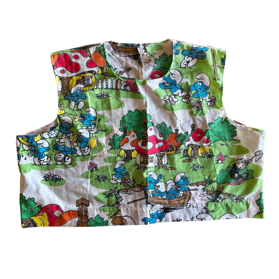 • Reworked crop top made from vintage Smurfs bedsheets