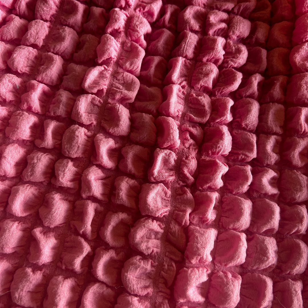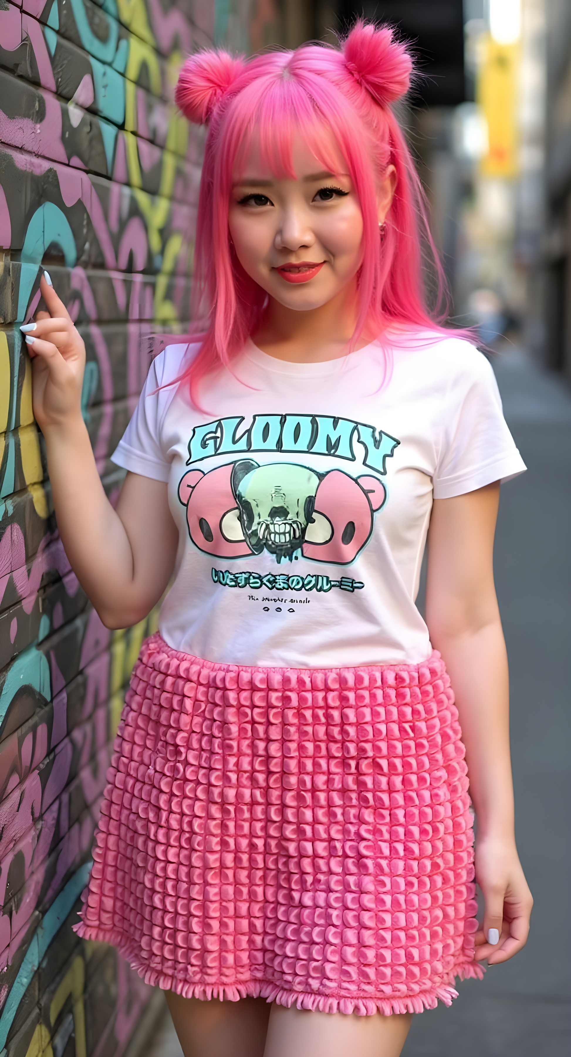 This one-of-a-kind dress is full of sass, softness, and sustainability. The top features a Gloomy Bear tee reworked from a preloved shirt, while the bottom is made from ultra-textured bubble-pink pants for the ultimate cozy-dollcore vibe.