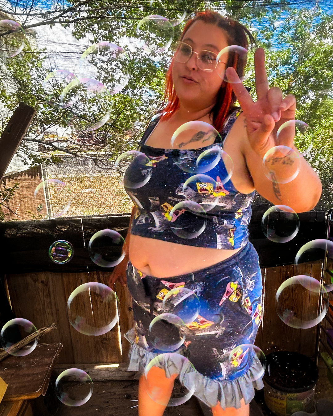 Cartoon chaos meets cosmic comfort in this Handmade Space Sponge Set. Reworked from upcycled pajama fabric, this matching crop top and ruffle shorts combo is soft, silly, and ready for lounging, dancing, or stargazing in style. It’s giving bedtime, but make it fashion.
