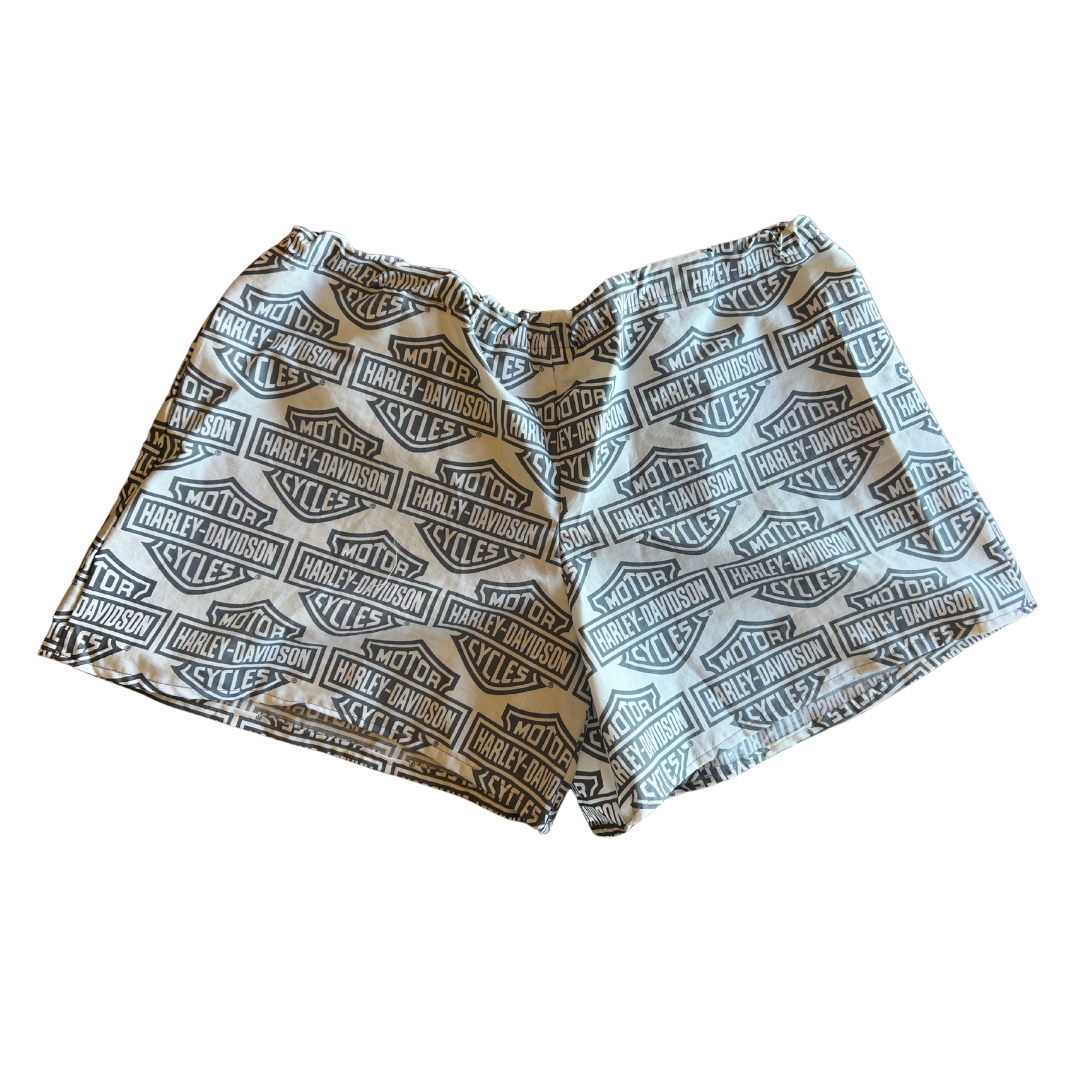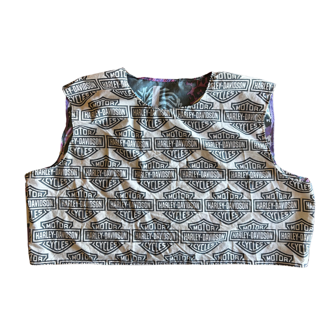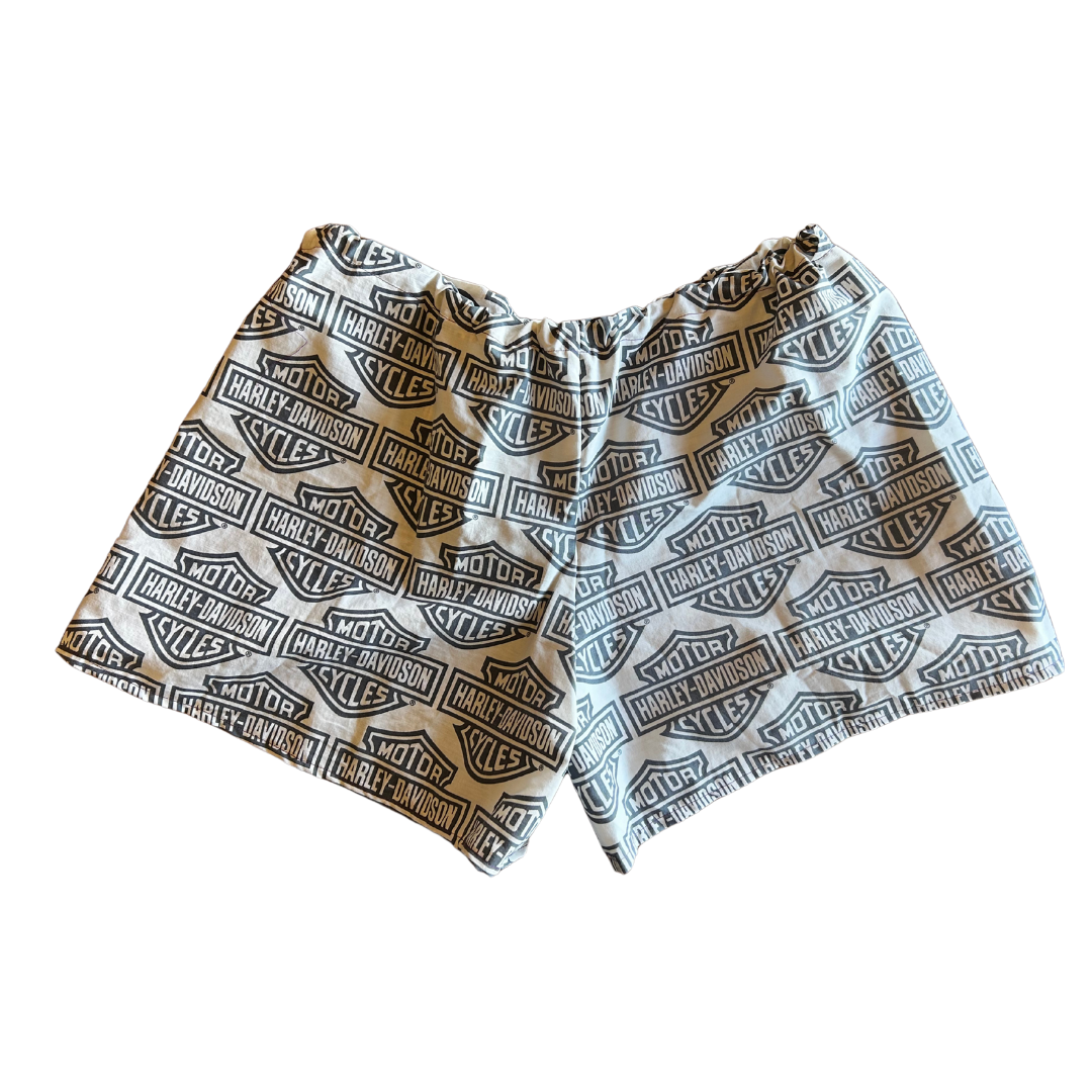 This upcycled two-piece set is a cozy and rebellious dream for anyone who lives for chrome, bold prints, and zero-waste fashion. Made from a vintage Harley-Davidson-themed bed sheet, it’s been reworked into a cropped boxy top and comfy elastic-waist shorts perfect for chill days, bike nights, or funky layering.