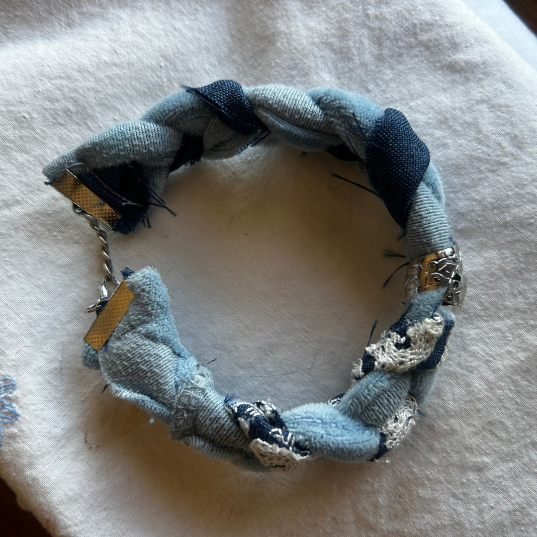 This Frayed Denim Charm Bracelet is crafted from soft blue and dark denim scraps, braided together with raw edges and rebel charm. Finished with a salvaged silver-tone earring accent and subtle lace detailing, it’s a statement of texture, memory, and making something magical from the forgotten.